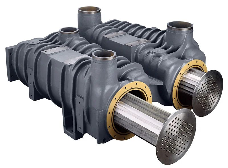 Shell‑and‑tube intercoolers/aftercoolers use corrosion‑resistant construction; covers open from both ends for easy cleaning. Labyrinth‑type demisters and auto‑drains remove condensate with >99% efficiency, reducing carryover and fouling.