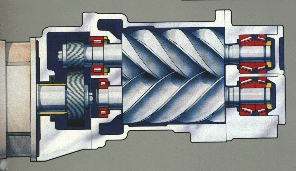 An oil‑injected rotary screw compressor uses intermeshing rotors. Air is trapped and compressed as the chamber volume decreases, while coolant seals clearances, removes heat, and lubricates bearings and gears. A built‑in pressure ratio delivers best efficiency near the rated discharge pressure.