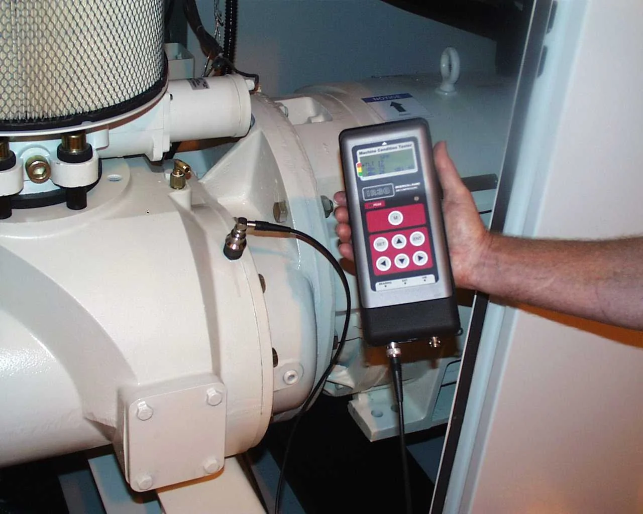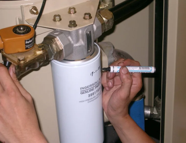 Typical: 150 h first oil‑filter change; ~2,000 h oil filter; ~8,000 h Ultra Coolant and coalescer (or earlier if ΔP > 0.6 kg/cm²); inspect inlet filters per environment; re‑grease motor bearings per spec; retorque electrical connections ~every 500 h.